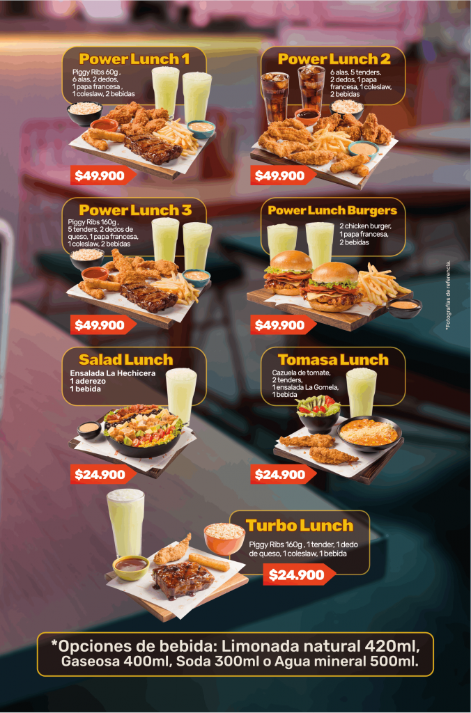 Opciones de Lunchbox individual:Costilla de cerdo (160g aprox), 1 tender (45g und), 1 fabulosos dedos de queso, 1 ensalada coleslaw (100g), 1 bebida*.