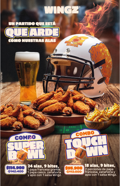 Pagando $114.900 recibe 24 alas con 3 salsas (25g c/u), 9 bites (trozos de pechuga apanados 15g und) con 1 salsa Sweet BBQ ahumada (25g), 1 porción de papas a la francesa agrandada (120g c/u), 1 porción de papas en casco (110g c/u) con 1 salsa Tennessee del Sur (25g c/u), 8 trozos de zanahoria, 6 de apio y 1 salsa Wingz (25g c/u). 1 ala Wingz = 1 trozo de ala. Válido para consumo en restaurantes Wingz, para llevar y a domicilio. A domicilio se cobra recargo. Domicilio sujeto a zona de cobertura. No válido para Rappi, Didi Food ni otras plataformas. Las imágenes de los productos son de referencia. El descuento no es redimible por dinero. Salsas según disponibilidad del restaurante. No acumulable con otros descuentos y/o promociones disponibles en WINGZ. Indispensable mencionar el cupón al momento de hacer el pedido. Válido desde el 28 de enero de 2026 hasta el 10 de febrero de 2026, o hasta agotar existencias. Son 1.000 combos disponibles. Estos términos y condiciones pueden variar y ser modificados en eventos de fuerza mayor y caso fortuito. No válido para acumulación ni redención de Puntos Colombia.