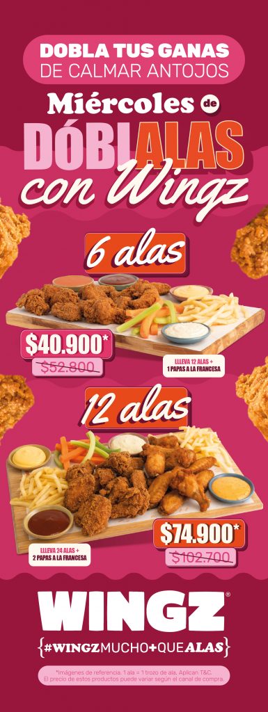 Aplica los miércoles desde apertura (12m) hasta cierre (10pm) de los restaurantes Wingz. No aplica para días festivos. Válido para consumo en restaurantes, para llevar y a domicilio. A domicilio el horario de cierre es a las 9pm. A domicilio se cobra recargo. Domicilio sujeto a zona de cobertura. No es válido cambiar las papas a la francesa por otro acompañante, no son válidos los agrandados de papas, no se autoriza guardar promociones para ser reclamadas posteriormente. Válido desde el 1 de octubre de 2025 hasta el 19 de noviembre de 2025 o hasta agotar existencias, lo que suceda primero. Son 6.000 combos disponibles. Las imágenes de los productos son de referencia. No válido para Rappi ni Didi Food. Salsas según disponibilidad del restaurante. No acumulable con otros descuentos y/o promociones disponibles en WINGZ. Estos términos y condiciones pueden variar y ser modificados en eventos de fuerza mayor y caso fortuito. No válido para acumulación ni redención de Puntos Colombia.